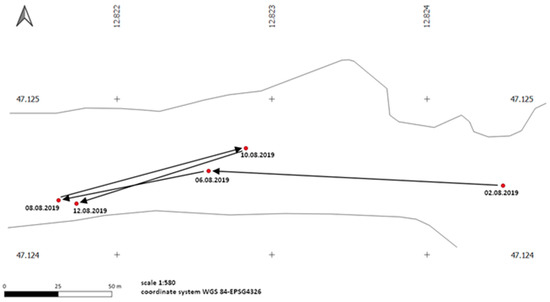 We analysed movement patterns in the habitat to infer migration potential as well as resource use and availability. The collected GPS data of captures and recaptures were used to reconstruct movement patterns. These were imported into QGIS 3.8.3 [34], and the direct geographic distance between capture and first recapture was determined for each individual by creating a linear distance matrix layer with the vector analyses tool in the WGS 84 (EPSG4326) Coordinate Reference System. For assessing the minimum total distance moved, we summed up the distances between all points of capture.