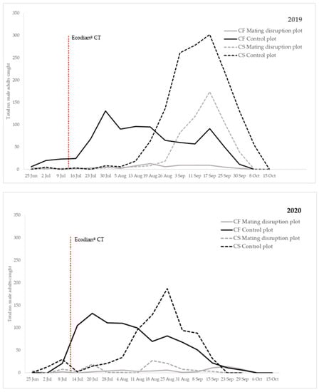 The efficacy of the MD method is also related to the phenology and mating activity of the investigated species, making the placement of pheromone dispensers within the canopy a major factor for MD success. Since for both populations pupation occurs in the soil, pheromones should be deployed from the ground up to the upper part of the canopy just prior to the start of moth emergence, to reduce the incidence of mating. In the literature, applications of innovative pheromone-dispensing methods (e.g., puffers) placed in the upper part of the canopy (about 8 m in height) have been tested in chestnut orchards. However, their effectiveness has not always proved satisfactory and, therefore, further studies would be needed to optimize the pheromone doses emitted, the positioning of the device and to assess the release of pheromones in the environment [24,40]. Conversely, Ecodian® CT dispensers applied vertically in the form of a wire from 0 m to 5–6 m may optimize the efficacy of this approach. The possibility of creating plumes of pheromones (conversely to the pheromone cloud typical of traditional MD through puffers or high dosage dispensers) in the flight range of the moths, makes this device more competitive on the market.