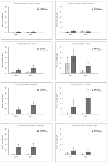 Average number (±SEM) of male adults of Cydia fagiglandana (left) and Cydia splendana (right) collected with pheromone-baited traps, in plots where mating disruption (grey histograms) was applied compared to control plots (black histograms) in 2019 and 2020. Bars with different letters are significantly different, according to the paired t-test (p < 0.05).