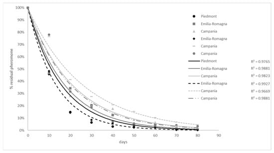 The release curve of the pheromone blend, showing the percentage of residual pheromone in the thread, is reported in Figure 3. This curve is compared to previous data obtained following the same protocol described in the Section 2.4 and Section 2.5 in Emilia-Romagna and Campania regions (Mereghetti P and Rama F, unpublished).