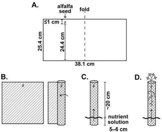 Alfalfa plants were grown hydroponically to be tested against CRC larvae. (A) One rhizobia-inoculated (Nitragin® Gold, Monsanto, St. Louis, MO, USA) alfalfa seed was placed no more than 1 cm from the top edge of a moistened germination paper (38.1 × 25.4 cm) (Anchor Paper Inc, St. Paul, MN, USA), which was then folded in half. (B) Papers with seeds were rolled into cylinders, and (C) placed into containers filled with a hydroponic growth solution (0 N-10 P-10 K, Alaska Morbloom, Central Garden and Pet Company, Walnut Creek, CA, USA; Immunox Multi-purpose Fungicide, Spectracide, Spectrum Brands, Madison, WI, USA) covering the bottom 5–6 cm of papers. Capillary action through the papers appropriately moistened seeds for germination and growth. (D) Plants were grown for approximately 2–4 months prior to use in larval trials.