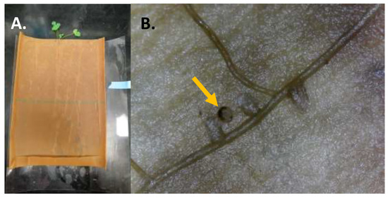 To evaluate alfalfa root nodule feeding and CRC larval survivorship and development, the arena (A) consisting of an outer transparency film cover and developing plant within germination paper was unfurled. The germination paper provided a substrate for roots and nodules to develop (B) and where a CRC larva (yellow arrow) could move and feed throughout the root zone, particularly on nodules.