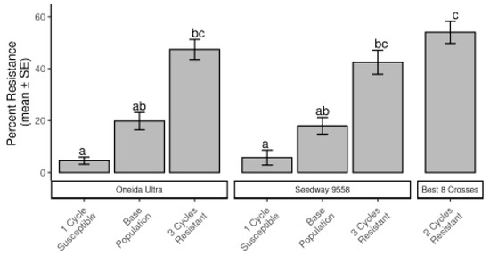 Comparison of alfalfa population mean (±SEM) percent resistance for populations resulting from divergent selection within cultivars Oneida Ultra and Seedway 9558, and a population developed from the best eight plants selected from a field and intercrossed for CRC resistance for two cycles of selection. Different letters above bars indicate significant differences resulting from Tukey HSD.