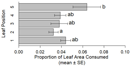 Comparison of leaf area consumed by adult CRC (NY1718 and NY1713 combined) by leaf position with 1 being the basal most trifoliate leaf and 5 the apical trifoliate leaf. Values shown are the mean (±SEM) proportion of leaf area consumed by caged mated pairs of adults. Different letters above bars indicate significant differences resulting from Tukey HSD.