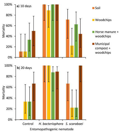 Mean (± 95% CI) mortality of third-instar Popillia japonica at (a) 10 and (b) 20 days at 20 °C after aqueous preparations (40 mL) of the entomopathogenic nematodes Heterorhabditis bacteriophora or Steinernema scarabaei (50 infective juveniles/cm2) were added to soil, woodchips, woodchips, and horse manure or wood chips and municipal compost in plastic containers (1 L).