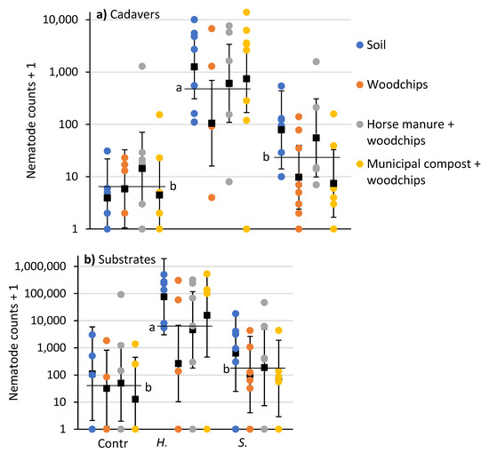 Counts (colored circles) and means (±95% CI) (black squares) of nematodes recovered in white traps from (a) P. japonica cadavers and (b) soil samples beneath substrates 10 days after aqueous preparations (40 mL) of Heterorhabditis bacteriophora or Steinernema scarabaei (50 infective juveniles/cm2) were added to soil, woodchips, horse manure and woodchips or municipal compost and woodchips in plastic containers (1 L). Entomopathogenic nematode species means (horizontal black lines) with the same letter are not significantly different in each panel (Tukey’s HSD test, α = 0.05).