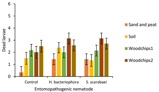 After 20 days, there was a significant effect of substrate type (F = 6.6; df = 4, 79.43; p < 0.0001) but not EPN species (F = 2.2; df = 2, 81.73; p = 0.121) or their interaction (F = 0.8; df = 8, 79.65; p = 0.628) on larval mortality (Figure 3). Larval mortality was significantly higher in plots with woodchips 2 (2.8 ± 0.27) and woodchips 1 + municipal compost (2.6 ± 0.27) than in plots with sand and peat (1.1 ± 0.27).