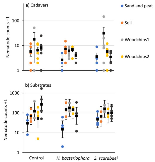 Counts (colored circles) and means (±SEM in (a) and ± 95% CI in (b)) (black squares) of nematodes recovered in white traps from (a) Popillia japonica cadavers and (b) mulch samples taken 20 days after inoculation of outdoor microplots (30 × 30 × 30 cm) partially filled with sand and peat, field soil, woodchip type 1 or 2, or municipal compost and woodchips type1 and inoculated with Heterorhabditis bacteriophora or Steinernema scarabaei. Galvanized steel microplots were placed in the soil in Agriculture and Agri-Food Canada research plots near Jordan Station, ON, Canada. No cadavers were recovered from the sand and peat control and the soil plus S. scarabaei microplots.