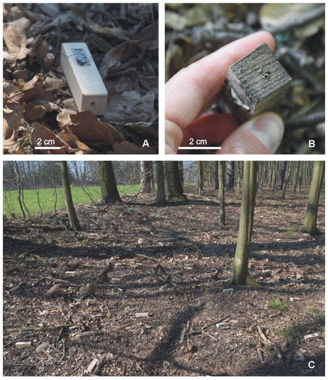 I used 150 such sites, with 50 available for each of the three groups. On 25 March 2020, the woodblocks were placed in the field attached to ca. 14 cm sticks that were poked into the ground (see Figure 2A). The distance between neighboring woodblocks was ca. 50 cm and they were located about 2–6.5 m from the edge of the forest (Figure 2C). The positions of the three types of nest sites were randomized.