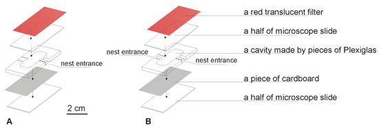 Nest design of the artificial nest sites used during the laboratory experiment: a cavity is created between a piece of cardboard and a 1/2 microscope slide (38 mm × 26 mm), which is kept apart by several pieces of Plexiglas as a frame (3 mm-thick) and coated with a piece of a red translucent filter. The volume of the cavity is ca. 0.78 cm3. Two types of nest sites were used: (A) with one entrance; and (B) with two entrances.