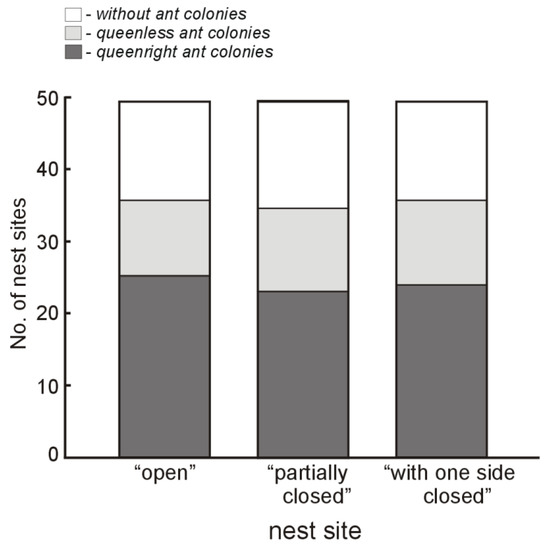 Number of artificial ‘open’, ‘partially closed’, and ‘with one side closed’ (see Figure 1) nest sites in which Temnothorax crassispinus ant colonies (queenright and queenless, respectively) or no ant colonies were found. As part of the field experiment, 50 artificial nest sites from each of the three groups were set in place in early spring 2020 and were then collected about two months later. Three of the nest sites (one from each group) were not included in the analysis, as during the experiment they had been pushed into the ground and their holes were blocked with soil.