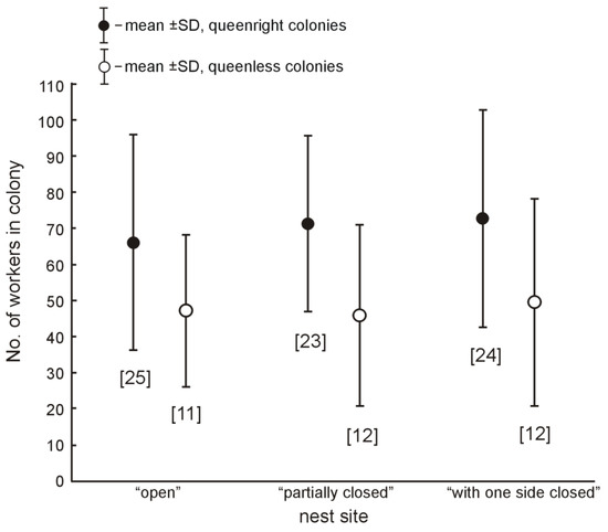 27 of the 36 ‘open’ and 27 of the 35 ‘partially closed’ nest sites containing ant colonies had two entrances. For the queenright colonies inhabiting the ‘open’ or ‘partially closed’ nest sites (for such nest sites, the colonies were able to create two nest entrances), there was no difference in the colony size (i.e., number of workers) for the type of site (F = 0.47, df = 1, p = 0.49), nor for the sites with a different number of entrances (F = 0.71, df = 1, p = 0.40, analysis for the nest sites with one and two entrances).