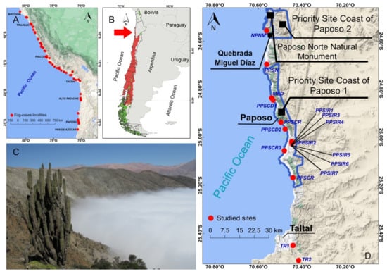 Regional context of the study area: (A) fog-oases along the Peruvian and Chilean arid coast (red dots). (B) The Mediterranean Chilean biodiversity hotspot (marked in red); Paposo-Taltal section highlighted by red arrow. (C) Camanchaca over the coastal cliffs of the study site. (D) Location of the studied sites in the coastal section North of Paposo to South of Taltal, and limits of Paposo Norte Natural Monument and Priority Site Coast of Paposo, 1 and 2 (Antofagasta Region, Chile).