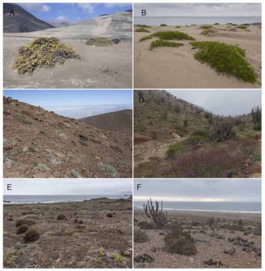 The longitudinal coastal belt of the Atacama Desert is made up of distinct ecological, climatic, and geomorphological zones [,,]. The range of habitats present in these zones and the relative stability of arid conditions since the Late Jurassic [] have allowed the evolution of a particularly diverse biota adapted to the arid conditions and the fluctuations in humidity and dryness of this coastal desert []. This particular area is characterized by the presence of a series of fog oases that can be considered as fine-scale hotspots of diversity and endemism in a latitudinal gradient at the northern margin of a global biodiversity hotspot [].