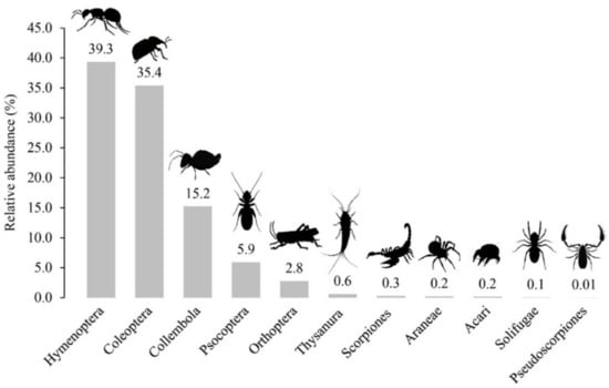 The taxonomic determination was carried out using a stereomicroscope magnifying glass connected to a camera lucida. The taxa nomenclature follows the specific references listed as Supplementary Materials in Table S1. Some taxa (e.g., Araneae, Collembola, and Hymenoptera) were taxonomically identified only at the level of morphotype/family due to the poor taxonomic knowledge on these groups.