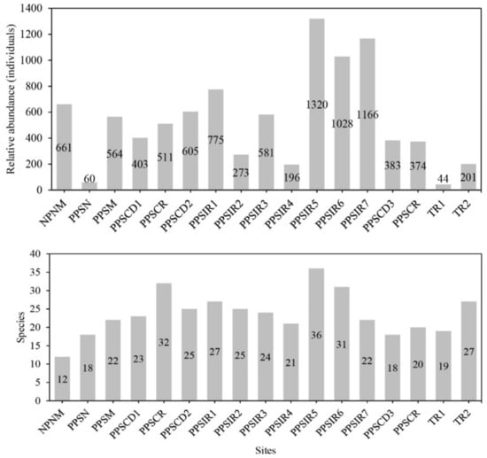 The richness and relative abundance of arthropods varied between the different sites under study. The sites with the highest number of species were PPSIR5 (36 species), PPSCR (32 species) and PPSIR6 (31 species). Most of the sites presented over 20 species. In terms of relative abundance, PPSIR5 presented the highest value (1320 individuals), followed by PPSIR7 (1166) and PPSIR6 (1028) (Figure 4).