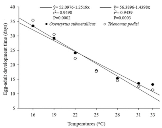 Based on the duration of the cycle development (egg–adult) at the different temperatures tested, the thermal constant (K) and the lower thermal limit of development (Tb) were determined. For O. submetallicus, the thermal constant was higher, indicating that it requires greater thermal accumulation (degree-days) to complete its development, different from T. podisi, which needs less heat accumulation. However, O. submetallicus has superior daily thermal accumulation potential, since T. podisi presented a higher base temperature. This means that there are no differences in the duration of the egg–adult cycle between the two species. The thermal requirements in the present study are similar to those found for T. podisi in Podisus nigrispinus eggs (Dallas, 1851) (Hemiptera: Pentatomidae), with a base temperature of 11.1 °C and thermal constant of 205.3 DD [21]. However, the thermal requirements were lower for Telenomus remus (Nixon, 1937) (Hymenoptera: Platygastridae) in the eggs of Spodoptera frugiperda (Smith, 1797) (Lepidoptera: Noctuidae), where the base temperature was 12.5 °C and the thermal constant was 158.9 DD [12]. This variation between the values found, both for base temperature and thermal constant for the two species studied, can better characterize its effects, if considered in development estimates, that is, the number of generations, for a long period when temperature becomes a limiting factor [21].