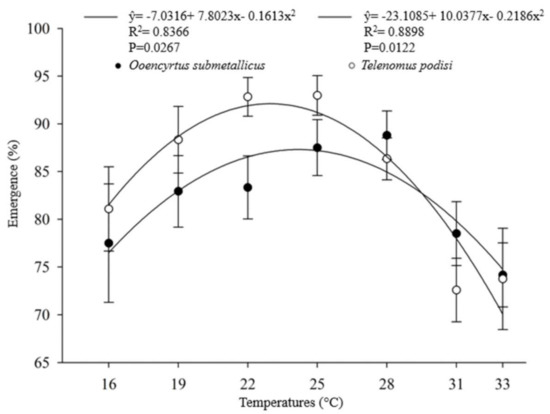 The developmental time (egg–adult) of the parasitoids presented an inverse relationship with increasing temperature. For O. submetallicus, the developmental time was 33.4 ± 0.25 days at 16 °C and 13.2 ± 0.09 days at 33 °C. The same pattern was observed for T. podisi, which was 35.4 ± 0.11 and 11.3 ± 0.11 days, when reared at 16 and 33 °C, respectively (Figure 1). The emergence of O. submetallicus was 74.2% and 88.8% at 28 and 33 °C, respectively; T. podisi achieved 92.9% emergence at 25 °C and 72.5% at 31 °C (Figure 2).