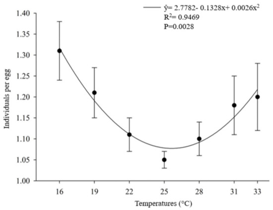 The experimental design was completely randomized, with seven treatments (temperatures) with 20 replications each (10 eggs each). For each temperature, the following characteristics were determined: developmental time (egg–adult in days), determined through daily observations, always at the same time; percent of emergence ((no. of eggs with emergence hole/no. of dark eggs) × 100); number of individuals emerged per egg parasitized; and sex ratio (sr = no. of females/no. total). The data obtained were subjected to analysis of variance, and when significant at 5% probability, regression analysis was performed. The equation that best fit the data was chosen based on the coefficient of determination (R2) and the significance of the regression coefficients (βi).