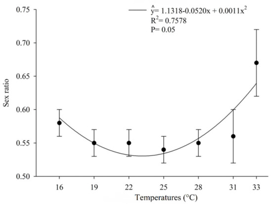 For O. submetallicus, there was no influence of temperature on the sex ratio, with 100% female offspring. According to Wilson and Woolcock [6], under temperature conditions higher than 29 °C, it is possible produce male offspring, a finding not observed in this study. The sex ratio for T. podisi was influenced by temperature, mainly at 16 and 33 °C, where there was a higher proportion of females than males. Similar results were obtained for T. podisi at temperatures below 15 °C, where only female emergence occurred [37]. This characteristic is considered satisfactory for both parasitoids at all studied temperatures because it presents a higher number of females in relation to males, an important factor in mass rearing systems and in the selection of individuals for field release as females are responsible for parasitism and the next generation [26].