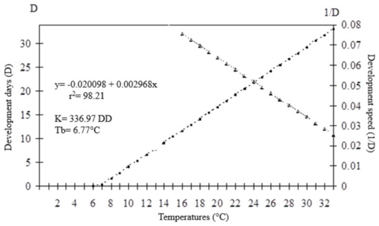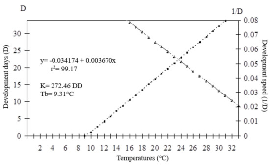 The efficiency, development, and reproduction of these parasitoids can be affected by abiotic factors such as light, humidity, and especially temperature, which is the factor that most influences biological aspects [10,11]. The body temperature of insects exposed to very high temperatures increases to lethal levels, whereas lower temperatures can cause physical damage, negatively affecting insect development [12], or compromise rates of development, emergence, parasitism, fecundity, and survival [13]. Thus, having knowledge of the ideal insect development temperature is essential for developing programs for the mass creation of parasitoids [14]; from information regarding the ability to adapt, it is possible to establish the optimal temperature for parasitoid development, estimate the number of generations for the regions in which they are located, and predict their establishment in the field [15].