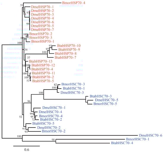 Maximum-likelihood phylogenetic tree of the HSP70/HSC70 proteins. The bootstrap values were displayed on the nodes. Bmor: Bombyx mori; Dmel: Drosophila melanogaster; Btab: Bemisia tabaci. Names of HSC70s were displayed in blue, all the HSP70s were displayed in red.
