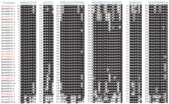 Signature sequences and typical regions of the heat shock proteins 70 family in B. mori, D. melanogaster, and B. tabaci. The consensus sequences were shown on the top of the alignments. The number before alignment represents the starting position in the corresponding sequence. The silkworm HSP70s/HSC70s were displayed in red. The similarity of the alignments was shaded with BOXSHADE v3.21 (https://embnet.vital-it.ch/software/BOX_form.html (accessed on 7 September 2021)).