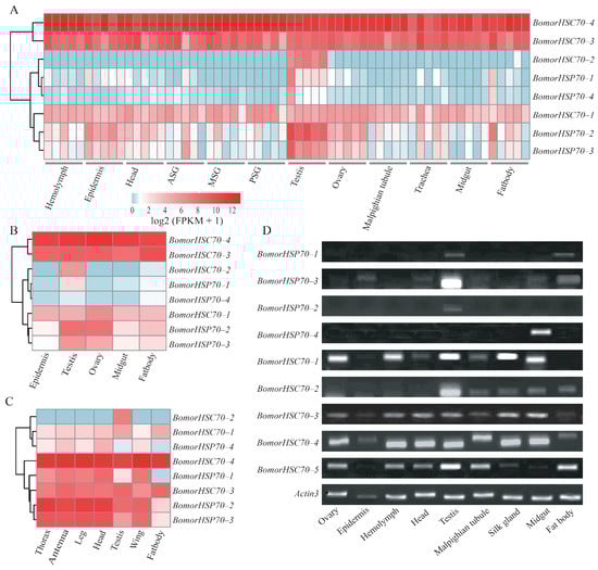 Spatio-temporal expression patterns of HSP70/HSC70 genes in the silkworm. (A) Expressions of HSP70/HSC70 genes in various tissues on day 3 of the fifth-instar larvae. (B) Transcriptional levels in various tissues of the pupae. (C) Tissue expression patterns in adults. Based on the transcriptome data, genome-wide analysis of developmental and tissue expression profiles was conducted in the silkworm and was deposited in SilkDB3.0 [43]. In this study, we downloaded the expression data (https://silkdb.bioinfotoolkits.net/base/download/ (accessed on 1 July 2021)) and extracted the corresponding expressions for the silkworm HSP70/HSC70 genes. Eight of them have expression data and were presented in (A–C). (D) Tissue expressions were detected by RT-PCR on day 3 of the fifth-instar larvae. The silkworm cytoplasmic actin A3 gene was used as an internal control and abbreviated as actin3.