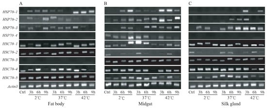 The transcriptional responses of HSP70/HSC70 genes after cold and thermal exposures. (A–C) Gene responses in the fat body, midgut, and silk gland, respectively. The larvae on day 3 of the fifth instar were exposed to 2 °C for 3 h, 6 h, and 9 h, and heat shock at 37 °C and 42 °C for 3 h, 6 h, and 9 h, respectively. All the treatment followed by 2 h recovery at 25 °C. Ctrl: control.