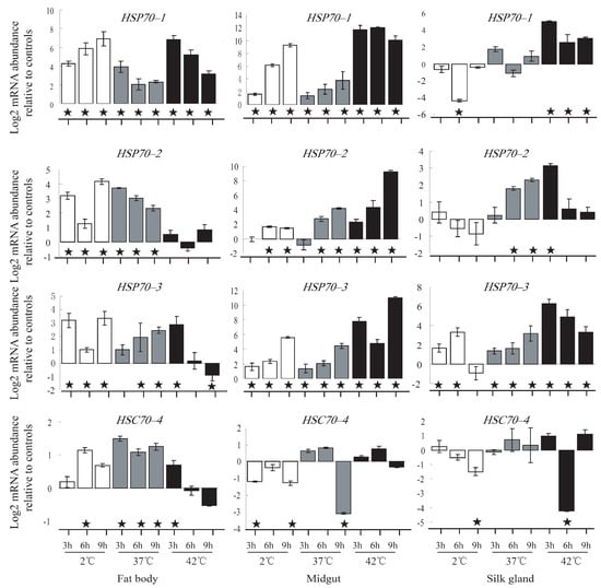 Relative expressions of HSP70–1, HSP70–2, HSP70–3, and HSC70–4 in the silkworm after exposure to cold and thermal stresses. It was indicated by Log2 qPCR ratios (i.e., Log2 mRNA abundance relative controls). The symbol (★) indicates mean values that are significantly (p < 0.05) different between a treated sample and its corresponding control. The positive and negative values indicate up-regulation and down-regulation in the treatment, respectively.