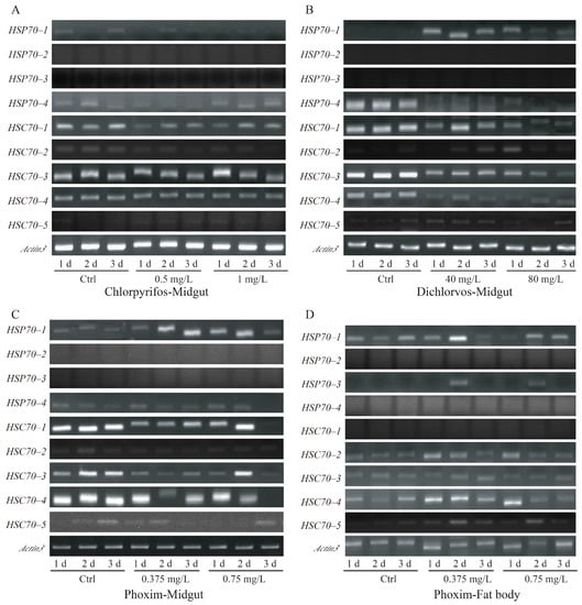 RT-PCR detection of response patterns for HSP70/HSC70 genes in the silkworm after exposure to three OPs. (A) Expressions in the midgut of the fifth-instar larvae after chlorpyrifos treatment. Two sub-lethal concentrations (0.5 mg/L and 1 mg/L) were used. (B) Responses of HSP70/HSC70 genes in the midgut of the silkworm under dichlorvos exposure. (C,D) Effects of phoxim exposure on the expressions of HSP70s/HSC70s in the midgut and fat body. Ctrl: control. The 1 d, 2 d, and 3 d mean 1 day, 2 days, and 3 days under OPs exposure, respectively.