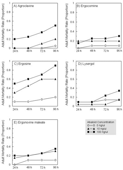Figure 1. Exposure-dependent mortality rates among Diaphornia citri nymphs exposed to leaves treated with increasing concentrations of agroclavine (A), ergocornine (B), ergosine (C), lysergol (D), or ergonovine maleate (E). See Table 3 for statistical results. The figure depicts morality observed with the control (0 ng/µL) and at the two highest concentrations tested, 10 and 100 ng/µL.