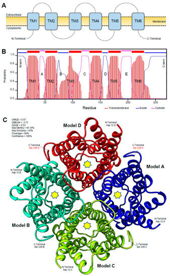 Protein characterization of aquaporin of D. citri. (A,B) Predicted membrane topology of DcAQP and domain architecture as predicted by TMHMM Server v. 2.0 and the Simple Modular Architecture Research Tool (SMART), respectively. (C) The predicted three-dimensional (3D) secondary model of DcAQP using a model from GENO 3D, which used crystallographic coordinates of Ratus norvegicus aquaporin 4 in the protein data bank (PDB ID: 2D57). Bioinformatic analyses were carried out using the available data of the official gene set (OGS-v2.0 proteins) for D. citri on the citrus greening solutions website (https://citrusgreening.org/organism/Diaphorina_citri/genome) and the available data on the GenBank, National Center for Biotechnology Information website (NCBI, https://www.ncbi.nlm.nih.gov/protein/ accessed on 16 September 2021).