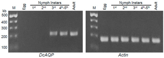 Recently, several roles for AQPs were described in silk moth egg development, including hydration and osmotic swelling of oocytes, and water transport during vitellogenesis [42]. However, in our results, we found that the expression pattern of the aquaporin DcAQP transcript in D. citri eggs was undetectable in agarose gel after semi-quantitative RT-PCR analysis. This result is possible if the eggs were diapaused or because the AQPs are expressed at different levels in different tissues during insect development, depending on the physiological necessity of the development stage [10,18].