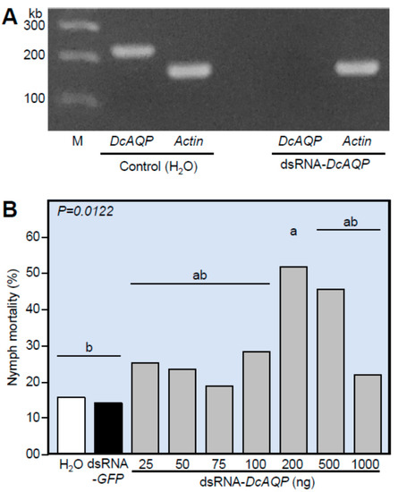 Effect of DcAQP silencing on the expression of DcAQP and the mortality of D. citri nymphs. (A) Semi-quantification of DcAQP after the treatment with 500 ng of dsRNA-DcAQP. Total RNAs were extracted using TRIzol® Reagent from 4th–5th nymph instars treated twice with dsRNA-DcAQP in comparison with H2O as a control. After amplification, transcript levels of DcAQP were semi-quantified on a 1.5% agarose gel. Actin was used as an internal control gene. (B) Mortality (%) of 4th–5th nymph instars of D. citri treated twice with different concentrations of dsRNA-DcAQP (25, 50, 75, 100, 200, 500 and 1000 ng·µL−1) in comparison with RNase-free water and dsRNA-GFP as controls. Bars and error bars represent means and SDs, respectively. Different letters indicate statistically significant differences among treatments, while the same letter signifies no significant differences among treatments using Tukey HSD (p < 0.05).