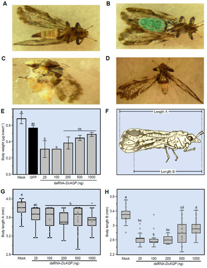 Effect of DcAQP silencing on the body weight and length of emerged adults of D. citri from treated nymphs. (A–D) Malformations of emerged adults of D. citri from treated nymphs after the treatment with dsRNA-DcAQP. (E) Body weight of D. citri adults emerged from nymphs after the treatment with different concentrations of dsRNA-DcAQP (25, 100, 200, 500 and 1000 ng·µL−1) in comparison with RNase-free water and dsRNA-GFP as controls. Bars and error bars represent means and SDs, respectively. Different letters indicate statistically significant differences among treatments, while the same letter signifies no significant differences among treatments using Tukey–Kramer honestly significant different test (Tukey HSD; p < 0.05). (F) Graphic illustration represents how the body length was measured. “Length A” covers the distance from the beginning of the head to the end of the wings, whereas “length B” covers the distance from the beginning of the head to the end of the body. (G) and (H) Body length (“Length A” and “Length B”, respectively) of D. citri adults emerged from nymphs after the treatment different concentrations of dsRNA-DcAQP (25, 100, 200, 500 and 1000 ng·µL−1) in comparison with RNase-free water as control. Horizontal thick lines indicate the medians; black or white dots indicate the means; boxes show the interquartile ranges including 25–75% of the values; whiskers reflect the highest and the lowest value of data. Different letters indicate statistically significant differences among treatments using Tukey HSD (p < 0.05).
