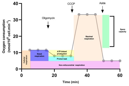 In order to specifically assess changes in mitochondrial function, cellular respiration, non-mitochondrial respiration, basal respiration, proton leak, maximal respiration, spare respiratory capacity and coupling efficiency were calculated [] (Figure 5).