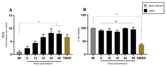 DENV2-infection induced high ROS levels in C6/36 cell line without affecting cell viability. C6/36 cells were infected with DENV2 at MOI 5 and incubated for different periods of time—6, 12, 18, 24, and 48 h post-infection. (A) ROS were measured with 5μM H2DCFDA. Data are expressed as fold increases over mock infected cells at each time point; TBHP was used as a positive control. (B) The cell viability was measured with MTT assay, the results are expressed as percentage of that of mock infected control; as a positive control 10% v/v of DMSO was used 12 h before treatment with MTT. All data are expressed as the mean ± SD obtained from at least three independent experiments. Significance was determined by Kruskal–Wallis test followed by Dunn´s multiple comparison test. p < 0.05 (*). ns: non-significant; MI: mock-infected; TBHP: tert-Butyl hydroperoxide; DMSO: dimethylsulfoxide; DENV: dengue virus.