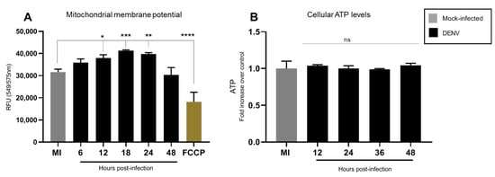 In mammalian cells, an increase in cellular respiration, decreased membrane potential, uncoupled mitochondria, and decreased energy charge in DENV-infected hepatic cells has been observed. Additionally, increased proton leak causing apoptosis has been described for DENV-infected HepG2 cells [].