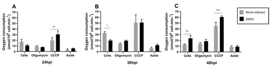 Typical profile of oxygen consumption in C6/36 mock and DENV2-infected cells. C6/36 cells were infected with DENV2 at MOI 5 and incubated at different time points of 24 hpi (A), 36 hpi (B), and 48 hpi (C). Oxygen consumption trace was determined using a high-resolution Clark-oxygraph in a 1.0 mL water jacket maintained under constant stirring at 28 °C, sequential injections of oligomycin, CCCP, and sodium azide were added. These chemicals act as an ATP synthase inhibitor, mitochondrial uncoupler, and inhibitor of complex IV, respectively. Data are shown as mean ± SD from three independent experiments. Statistical analyses were performed by two-way ANOVA and Sidak´s multiple comparison test. p < 0.05 (*), p < 0.001(**), p < 0.0001 (***). MI: mock-infected; CCCP: carbonyl cyanide m-chlorophenyl hydrazone; hpi: hours post-infection; DENV: dengue virus.