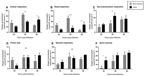 DENV2 induced changes in mitochondrial function of C6/36 cell line. C6/36 cells were mock and DENV2-infected at MOI 5 at different times post-infection, and respiration parameters were determined. (A) Cellular respiration was measured before the injection of any inhibitors. (B) Basal mitochondrial respiration. (C) Non-mitochondrial respiration was obtained after azide injection. (D) Proton leak. (E) Maximal respiration. (F) Spare capacity. Data are shown as mean ± SD from three independent experiments. Statistical analyses were performed by two-way ANOVA and Sidak´s multiple comparison test. p < 0.05 (*), p < 0.001 (**), p < 0.0001 (***), p < 0.00001 (****). ns: non-significant; DENV: dengue virus.