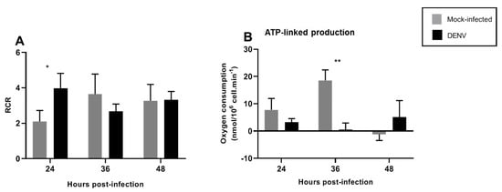 The RCR is a useful measure to determine the integrity of the inner mitochondrial membrane and coupling of the electron transport chain in the synthesis of ATP. The RCR was calculated by divide CCCP (state 3u) between oligomycin (4o) (3u/4o). Increased RCR was observed upon DENV infection at 24 hpi, returning to basal levels after 36 hpi (Figure 6A). Additionally, ATP-linked production decreased at 36 hpi and returned to normal levels after 48 hpi (Figure 6B).