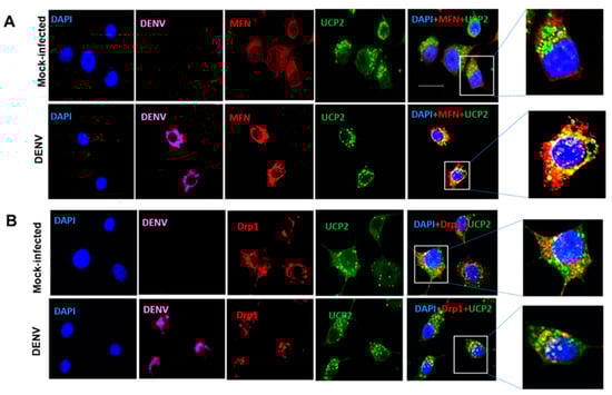 DENV2 induced MFNs translocation into the mitochondria of C6/36 cells. All cells were infected and mock-infected with DENV2 at an MOI of 10 and fixed at 36 hpi. Mitochondria were visualized by anti-UCP2 immunostaining and nuclei were visualized by DAPI stain (A) Colocalization of MFN and UCP2 in DENV infected mosquito cells (C6/36). MFN shown in red, UCP2 in green, and DENV in magenta. Magnified images of boxed area show merged fluorescence of MFN and UCP2 (yellow). (B) Drp1 does not colocalize with UCP2. Drp1 shown in red, UCP2 in green, and DENV in magenta. The insets show magnifications of the selected zones. The images were taken with an Olympus FluoView 1000 confocal microscope (scale bar, 20 μm). Representative images of three independent experiments are presented. MFN: mitofusins. Drp1: dynamin-related protein 1. UCP2: uncoupling protein 2. DENV: dengue virus.