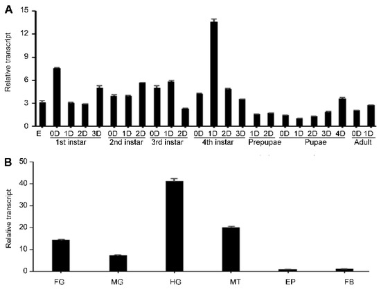 Temporal (A) and tissue (B) transcription patterns of HvvATPaseG in Henosepilachna vigintioctopunctata. For temporal expression analysis, RNA templates were derived from eggs (day 3), the larvae from the first through the fourth instars, prepupae, pupae and adults (D0 indicated newly ecdysed larvae or pupae, or newly emerged adults). For tissue expression analysis, the relative transcripts were measured in the foregut (FG), midgut (MG), hindgut (HG), Malpighian tubules (MT), epidermis (EP) and fat body (FB) of the day 1 final instar larvae. For each sample, three independent pools of 20–30 individuals were measured in technical triplicate using qRT-PCR. The values were calculated using the 2−ΔΔCT method. The relative transcripts are the ratios of copy numbers in different developing stages relative to egg, or those in different tissues relative to EP, which are set as 1. The columns represent averages with vertical lines indicating SE.