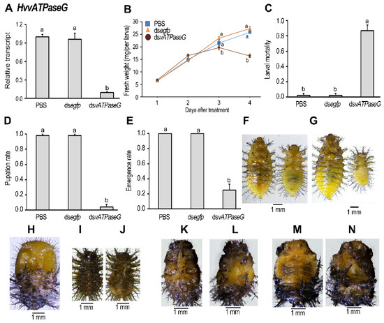We dietarily introduced dsvATPaseG into the newly-molted fourth-instar larvae in order to explore the physiological roles. After three days’ ingestion of dsvATPaseG, the mRNA level of HvvATPaseG was significantly downregulated (Figure 2A). Moreover, larval growth was inhibited when measured by the larval fresh weight, compared with the PBS- and dsegfp-fed beetles (Figure 2B. Consequently, the larval sizes of the HvvATPaseG hypomorphs were smaller than those in the dsegfp-fed ones (Figure 2F,G: dsegfp-fed beetle (left) v.s. treated one (right)).