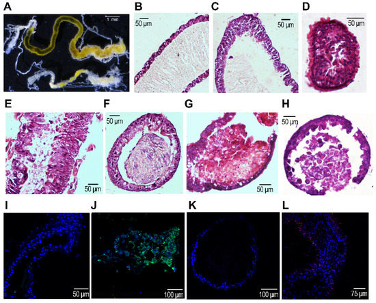 Feeding dsvATPaseG affects the structure of midguts in Henosepilachna vigintioctopunctata. The newly-ecdysed fourth instar larvae had ingested PBS-, dsegfp-, and dsvATPaseG-dipped leaves for three days. The guts were dissected 4 days after the initiation of bioassay (A). The midgut sections from dsegfp- (B–D) and dsvATPaseG-fed (E–H) larvae were stained with hematoxylin-eosin (HE) method. The midguts from PBS- and dsegfp-fed larvae have tall and columnar epithelium cells (EP) and clear peritrophic membrane (PM), in contrast to dsvATPaseG-fed larvae. Midgut sections from fourth-instar larvae were stained with DAPI and Hoechst 33342 and to visualize the DNA, and TUNEL kit and 5-ethynyl-2′-deoxyuridine (EdU) Alexa FluorTM 594 to see the apoptotic and actively dividing cells respectively. Merged images of DAPI/TUNEL (I,J) and Hoechst 33342/EdU staining are shown (K,L). The TUNEL- and EdU-positive cells in the midgut of dsvATPaseG-fed larvae are green and red in color respectively (J,L), in contrast to DAPI-positive cells (blue) in the midgut of dsegfp-fed larvae (I,K).