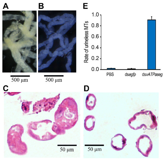 The Malpighian tubules from dsegfp-fed larvae were opaque. In contrast, the tubules in dsvATPaseG-fed larvae were clear (Figure 4A). The HE staining showed that the tubules from dsegfp-fed larvae were full of urine (Figure 4B), whereas most of the tubules in dsvATPaseG-fed larvae were empty (Figure 4C–E).