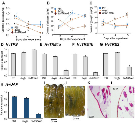 After ingestion of dsRNA for 3 days and the normal leaves for 2 additional days, the contents of glucose, trehalose and glycogen in the whole larvae were tested (Figure 5A–C).