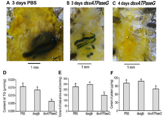 The accumulation of lipid and protein in the HvvATPaseG RNAi larvae in Henosepilachna vigintioctopunctata. The newly-ecdysed fourth instar larvae had ingested PBS-, dsegfp-, and dsvATPaseG-dipped leaves for three days, and in normal foliage for an additional of 2 days. The larval specimens 3 and 4 days after experiment were collected and dissected (A–C). The contents of triglyceride, total soluble amino acids and proteins were determined 5 days after experiment (D–F). The bars represent values (±SE). Different letters indicate significant difference at p value < 0.05 using analysis of variance with the Tukey-Kramer test.