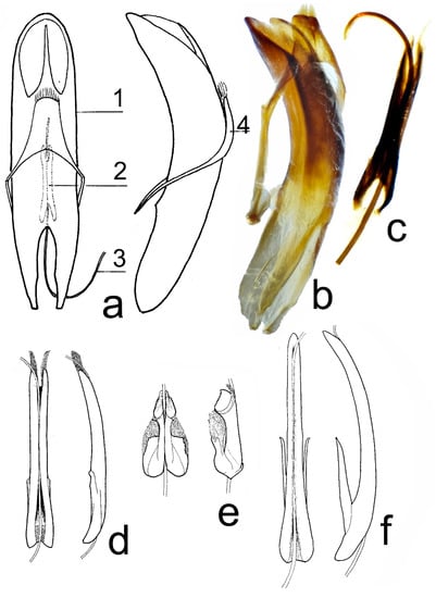 Male genitalia. (a) Timarcha hummelii, dorsal, and lateral view: 1—median lobe of aedeagus, 2—manubrium within median lobe, 3—flagellum, 4—tegmen; (b) T. hummelii, neotype, ZMMU, median lobe, lateral view; (c) T. hummelii, neotype, ZMMU, manubrium, dorsal view; (d) T. hummelii, W. Caucasus; (e) T. metallica, Tirol; (f) T. corinthia, Montenegro; (d–f) manubrium and flagellum, dorsal and lateral view.